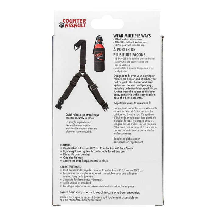 Ideal for hunting and fishing, the Chest Holster can be used as a chest holster, belt holster, or clipped on with the swivel clip. Universal Chest Holster fits both 290g 10.2 oz. and 230g 8.1 oz. Counter Assault bear sprays (sold separately).