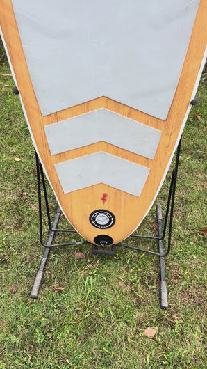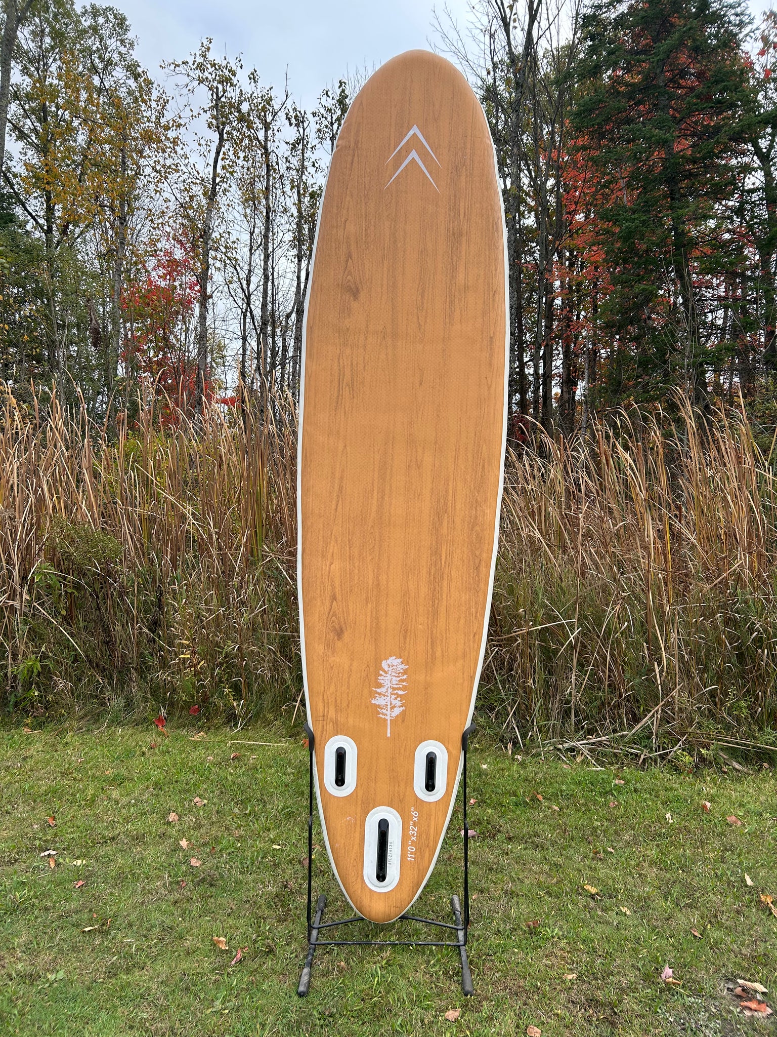This board was made to look like wood grain to keep it 'au natural' while you're out in the peace and quiet. It's imprinted with our signature jack pine emblem at the tail of the front and back.
